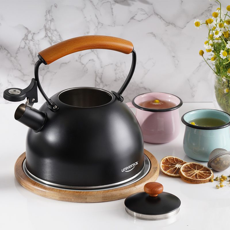 Prepara tus bebidas calientes con estilo y seguridad con la tetera Rustik Black de Universal. Con capacidad de 2.3 L, cuerpo en acero inoxidable y boquilla silbadora que avisa cuando el agua está lista. Compatible con gas, electricidad, vitrocerámica e inducción. ¡Elegancia y funcionalidad en tu cocina!