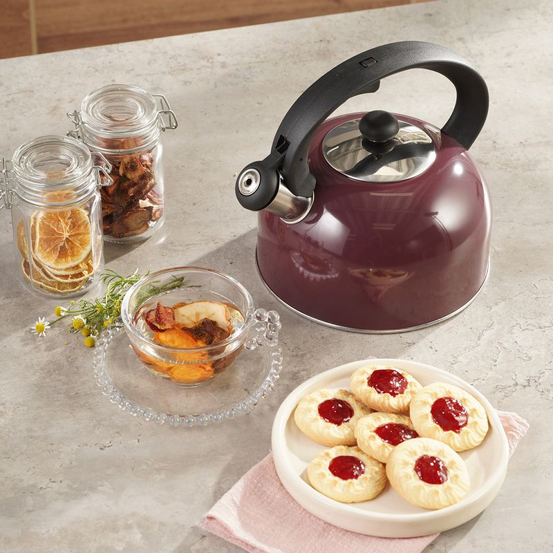 La Tetera Vino Tinto de acero inoxidable Universal tiene una capacidad de 2.5 litros, ideal para preparar té, infusiones y más. Su boquilla emite un silbido cuando el agua hierve, y su diseño incluye una tapa con pomo desmontable y una manija ergonómica de nylon para un manejo seguro. Fabricada en acero inoxidable duradero, es compatible con gas, eléctricas, vitrocerámicas e inducción. Con un diseño moderno, su color vino tinto se adapta a cualquier estilo de cocina.